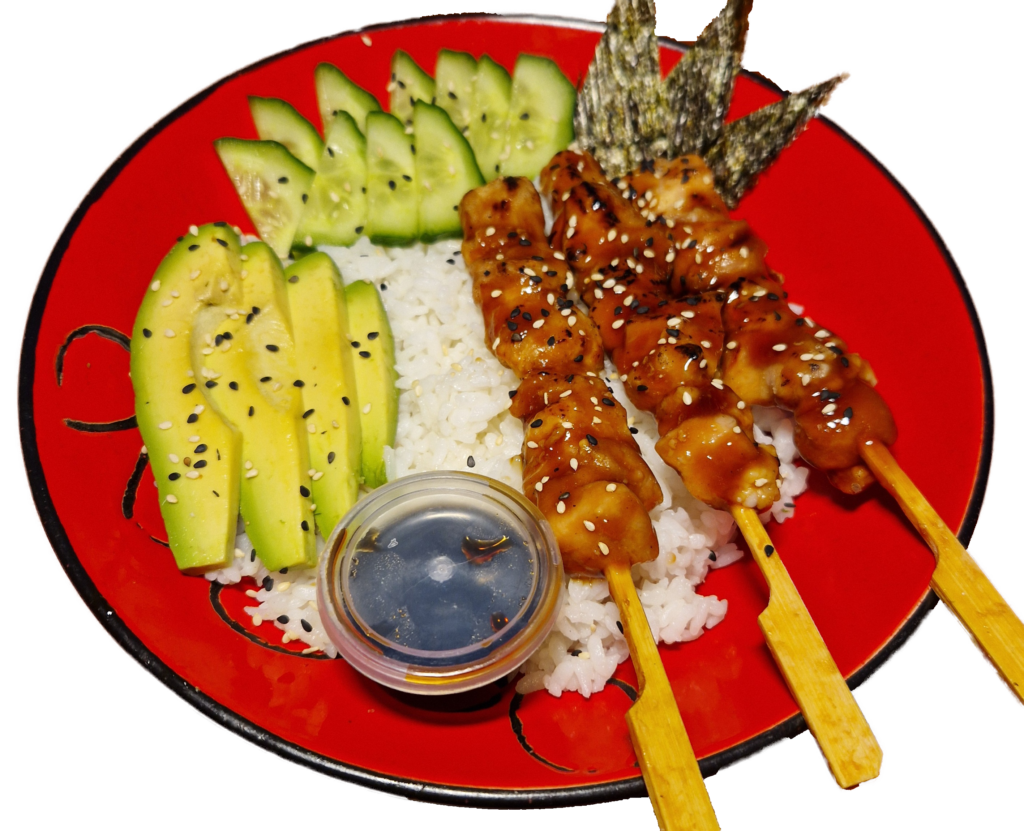 37. Bowl mit Reis, Yakitoki Spieß ( ohne Spieß ), Avocado,Gurke, Sesam,TeriyakisoßePreis: 9,90 €